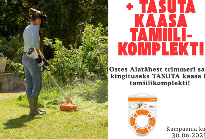 Ostes Aiatähest trimmeri või rohulõikuri, saad TASUTA kaasa TRIMMITAMIILI komplekti! Kampaania kuni 30.06.2025.